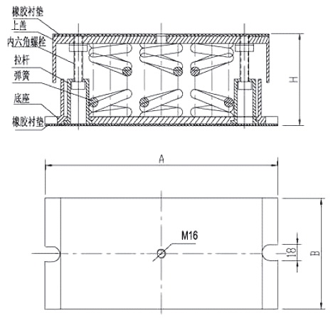 CTE2型預(yù)應(yīng)力阻尼彈簧隔振器為封閉式結(jié)構(gòu),上下端面粘貼橡膠襯墊,可通過固定孔連接上下端面,也可直接放置在底座與支承結(jié)構(gòu)之間。彈簧外全包套不銹鋼氣液網(wǎng)絲作為阻尼材料,阻尼系數(shù)大。因此,具有結(jié)構(gòu)合理、性能穩(wěn)定、使用方便等特點,特別適合于大型機械設(shè)備以及隔聲房、消聲室的基礎(chǔ)隔振。